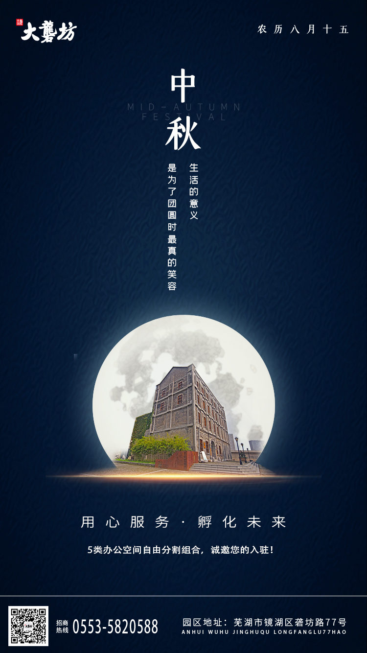 又是一年中秋時(shí),又是一年團(tuán)圓日。想必又是一次美好的“小長(zhǎng)假”。在此,大礱坊科技文化園向各位企業(yè)及所有工作人員送上真誠(chéng)的節(jié)日祝福,祝大家闔家團(tuán)圓,幸福安康。